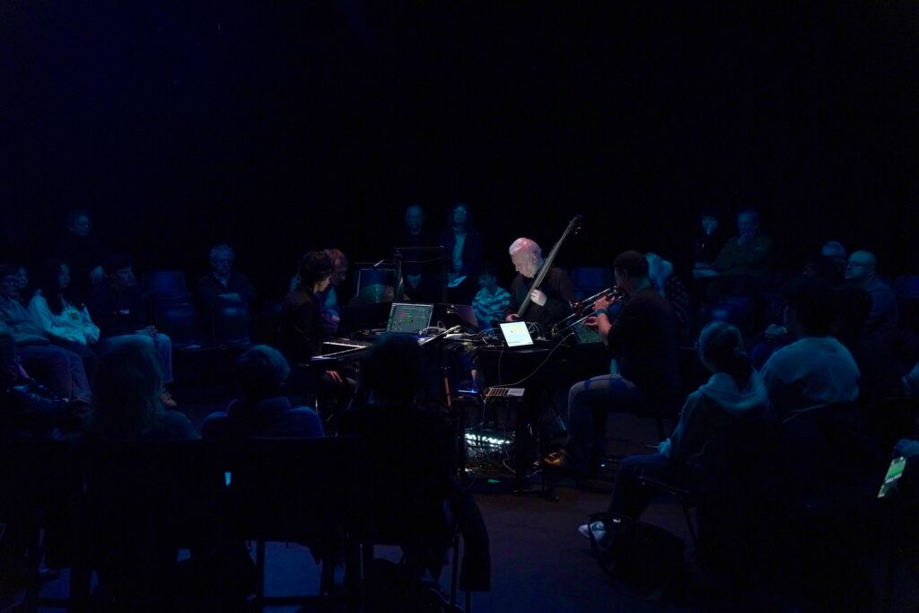 Enfin, la « scénographie acoustique la pièce », une disposition concentrique avec les quatre musicien·ne·s au centre, en un petit groupe serré, entouré des spectateur·rice·s et l’ensemble encerclé par le système de diffusion sonore, est un élément de la composition musicale à part entière qui, d’une part, place musicien·ne·s et auditeur·rice·s dans le même espace, largement immersif, et d’autre part décorrèle le geste instrumental de son résultat auditif, participant à l’écoute d’une masse, d’une globalité, et non pas de ses composant discrets – un vaste ensemble où les courants et les vagues se croisent en une lente agitation continue.